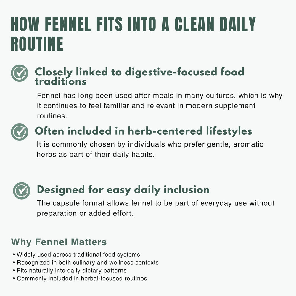Fennel (Foeniculum vulgare) has been traditionally used across cultures, especially after meals, where it was valued for supporting digestion, gut comfort, and internal balance when consumed regularly.