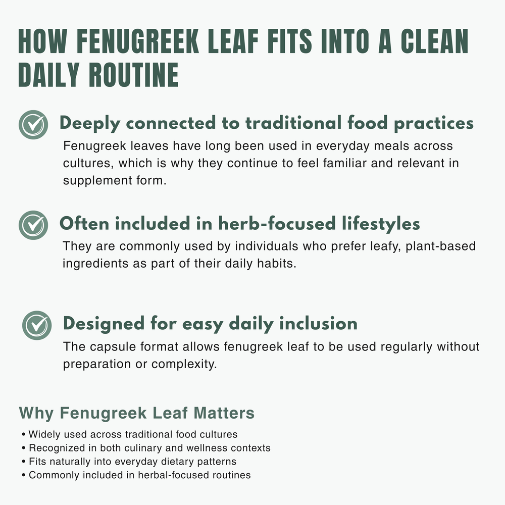 Clean fenugreek leaf supplement crafted to support digestion, metabolism balance, internal comfort, and long-term...