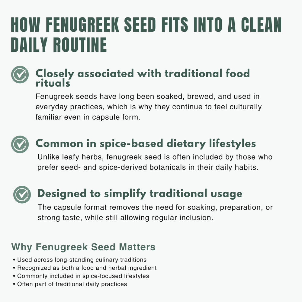 Fenugreek seeds (Trigonella foenum-graecum) have been traditionally used across everyday nutrition practices, where they were valued as part of diets supporting digestion, internal balance, and overall vitality when consumed regularly.
