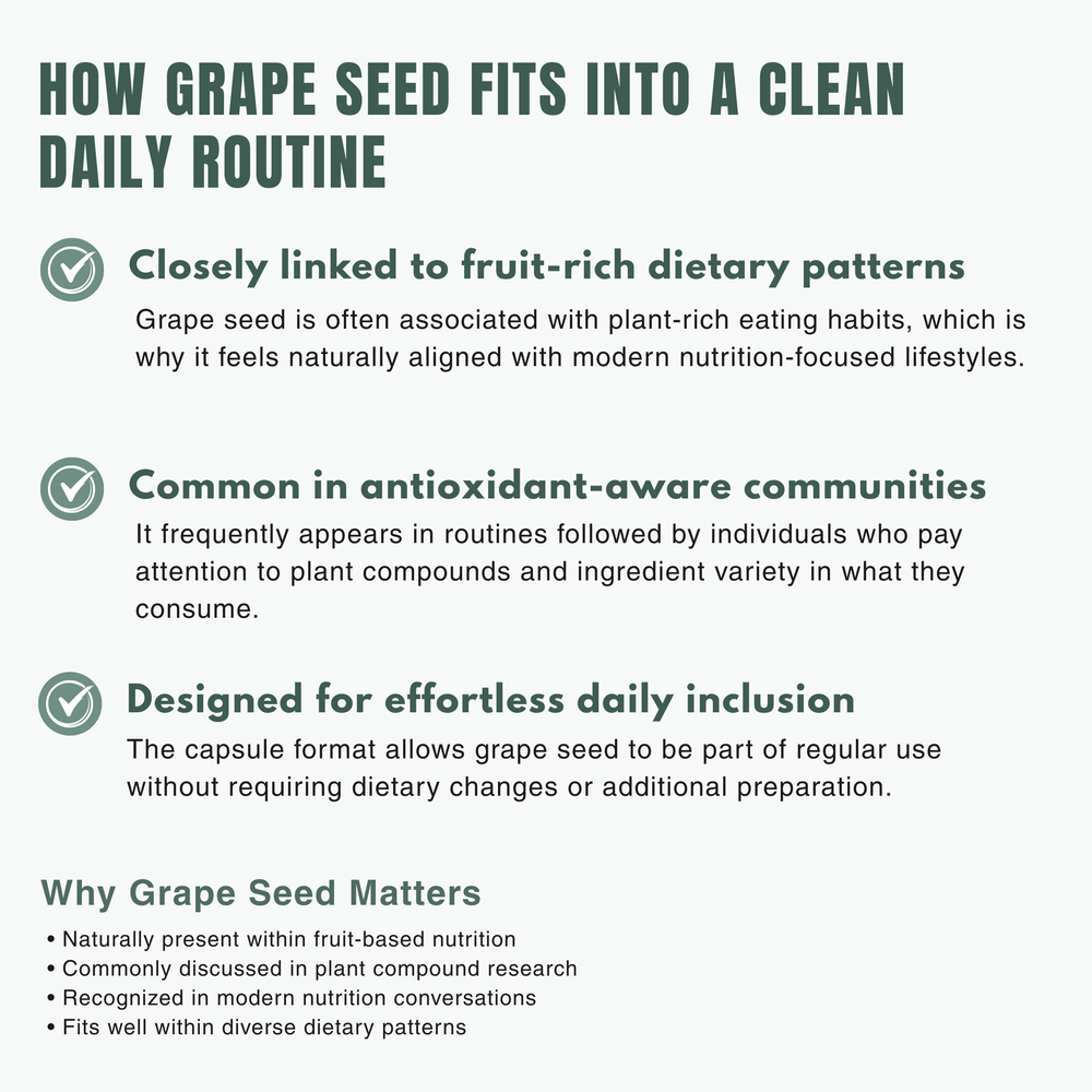 Grape seeds (Vitis vinifera) have been traditionally valued and are widely recognized in modern nutrition for their naturally occurring antioxidant compounds, commonly used to support skin appearance, circulation, and overall vitality when taken regularly.