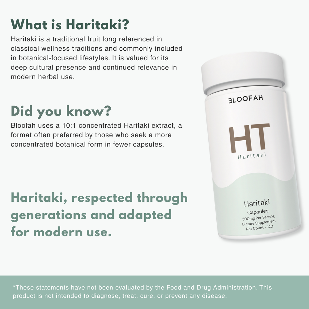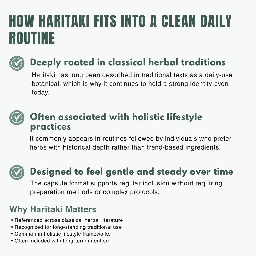 Haritaki (Terminalia chebula) has been valued for centuries in traditional wellness practices, where it was commonly used as part of daily routines supporting digestion, internal cleansing, and overall balance when taken regularly.