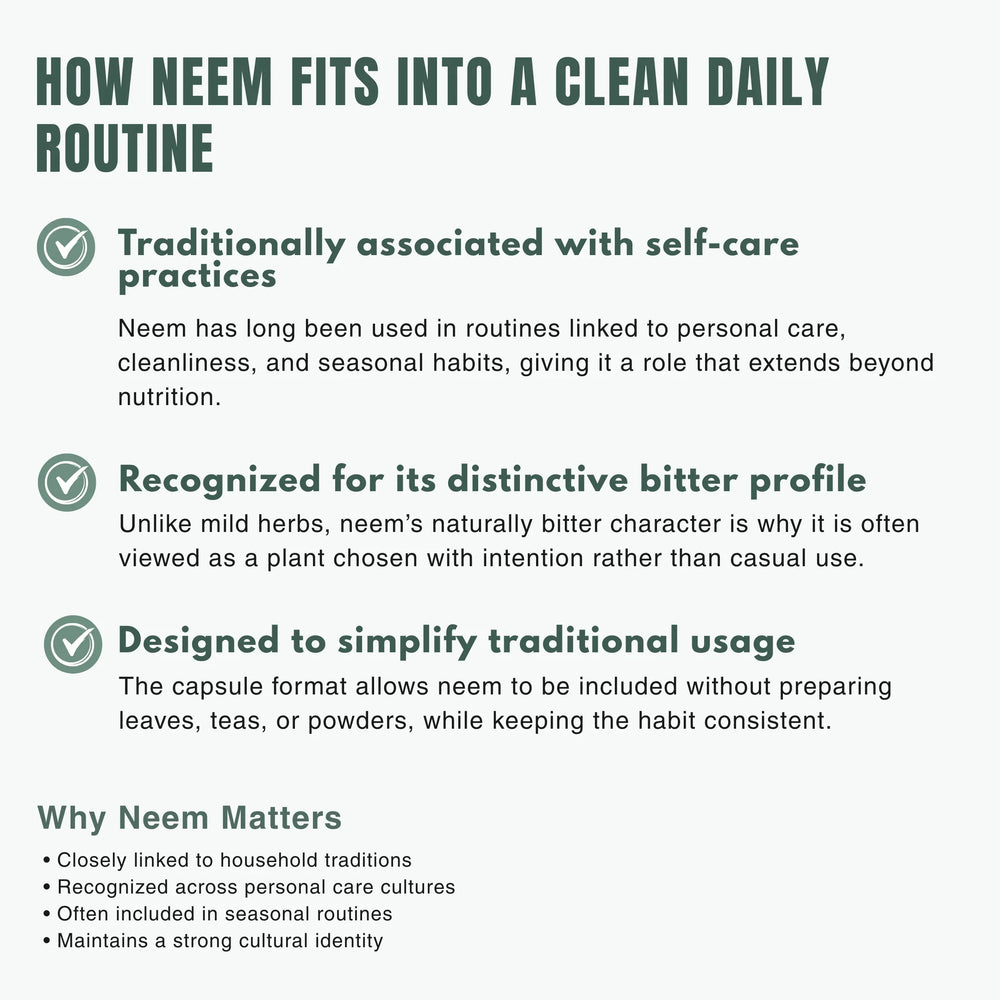 Neem (Azadirachta indica) has been traditionally valued for centuries in everyday nutrition and self-care practices, where it was commonly used as part of routines supporting skin balance, internal cleanliness, and overall wellness.