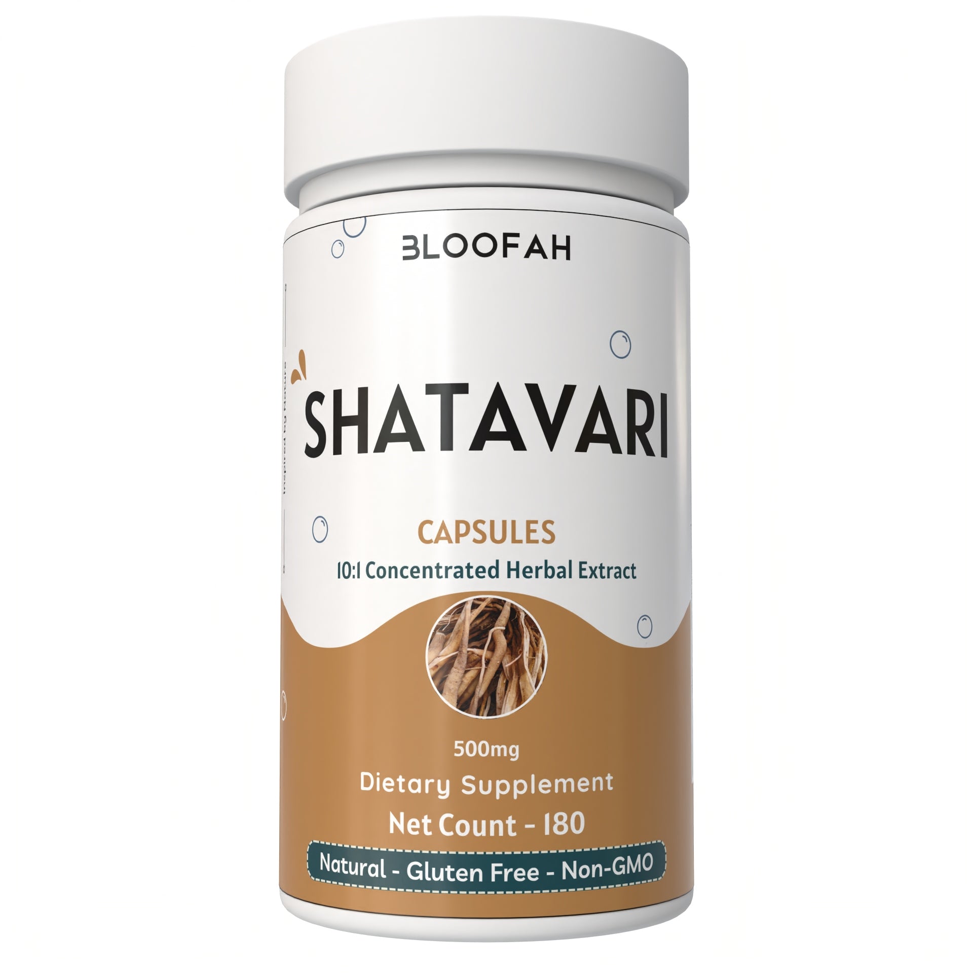 Elevate your wellness with Bloofah Shatavari Capsules, featuring a potent 500mg dose of Shatavari extract per capsule. Our formula includes a concentrated 10:1 extract ratio, providing a high-quality supplement that maximizes the benefits of this revered herb. Made from 100% pure Shatavari (Asparagus racemosus), our capsules are designed to offer a clean, natural supplement that is free from GMOs, gluten, and artificial additives.