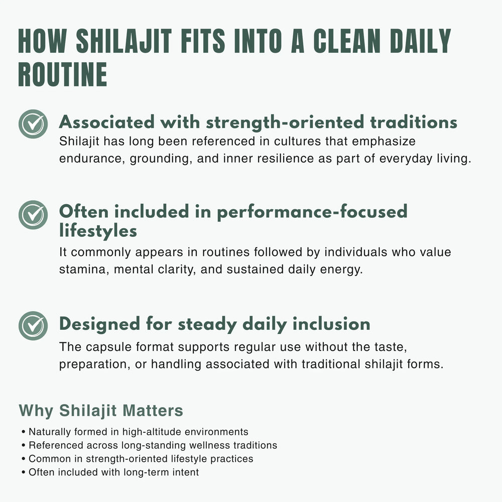Shilajit has been traditionally valued in mountainous regions for centuries and has gained modern recognition for its naturally occurring mineral compounds, commonly used to support vitality, stamina, and overall balance when taken regularly.