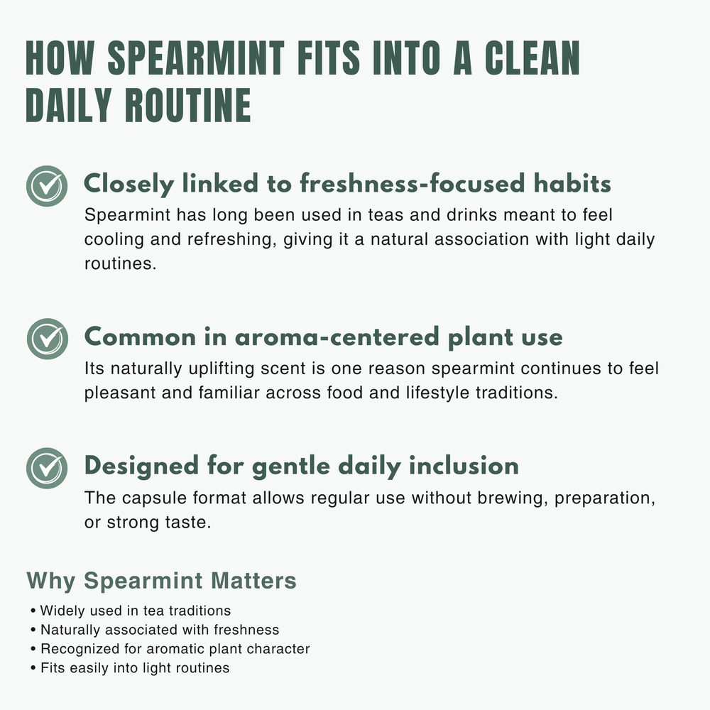 Spearmint (Mentha spicata) has been traditionally valued across food and wellness practices for its refreshing nature and is commonly used to support comfort, freshness, and digestive ease when consumed consistently.