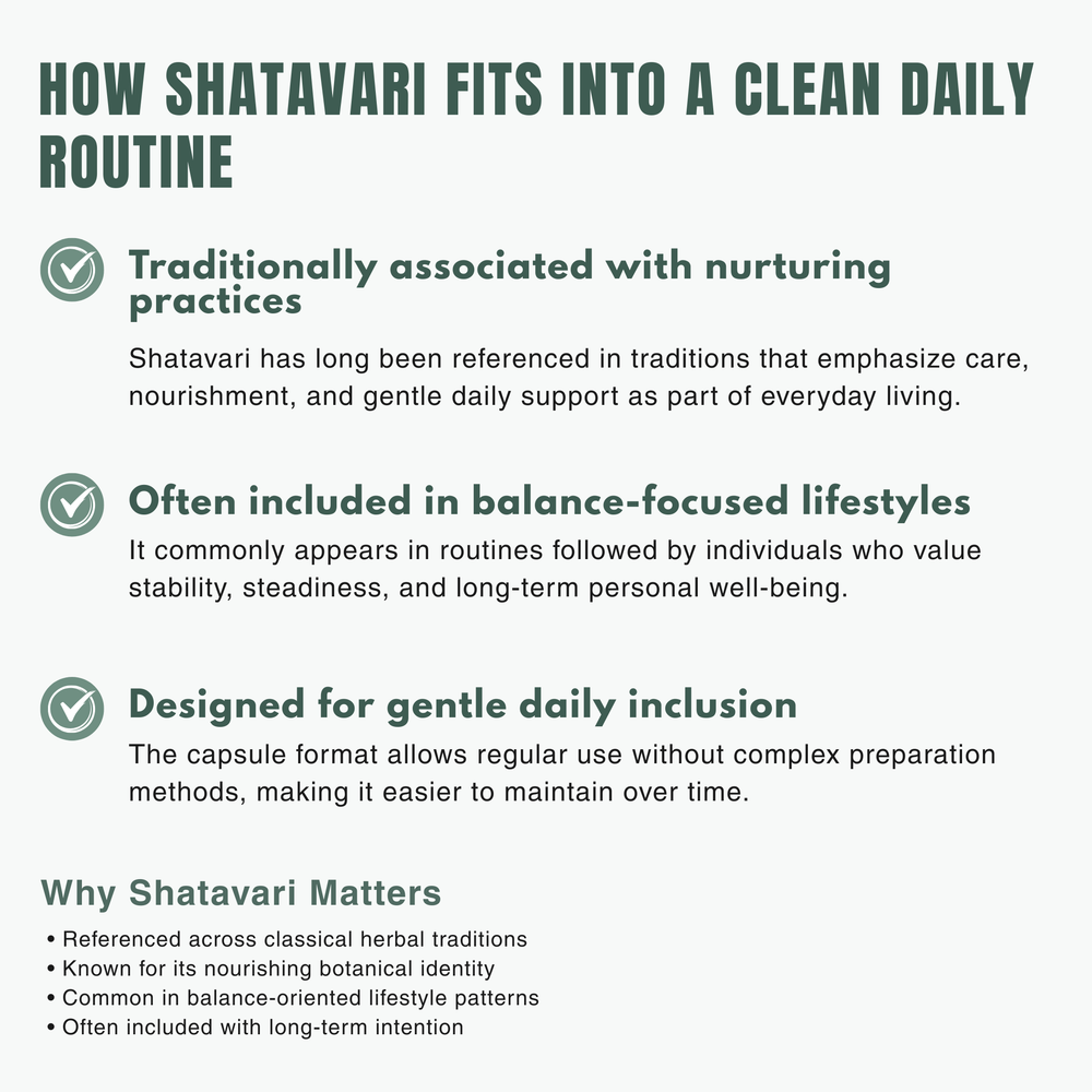 Shatavari (Asparagus racemosus) has been traditionally valued in holistic wellness practices, where it was commonly used as part of routines supporting balance, resilience, and overall vitality when consumed regularly.